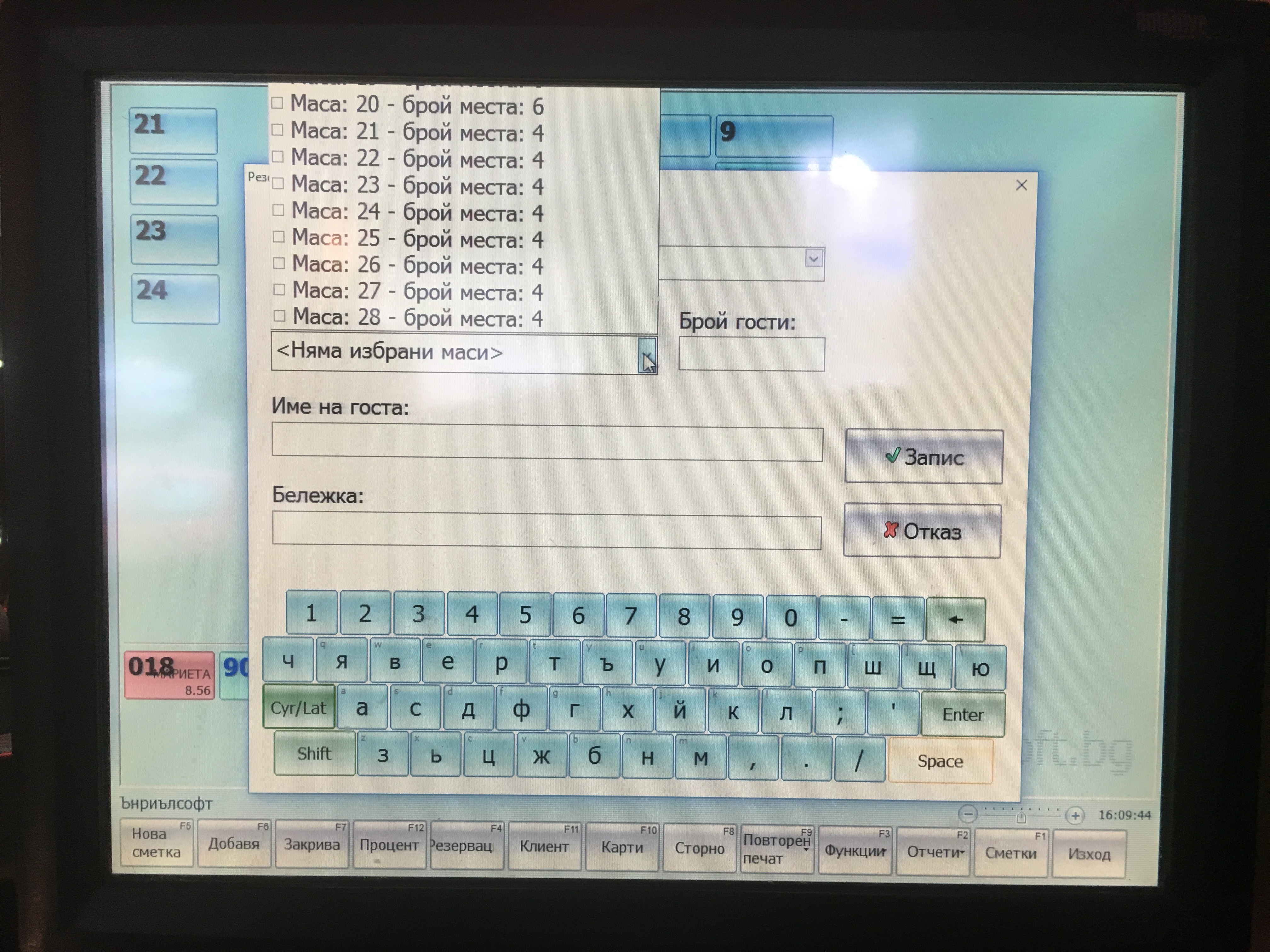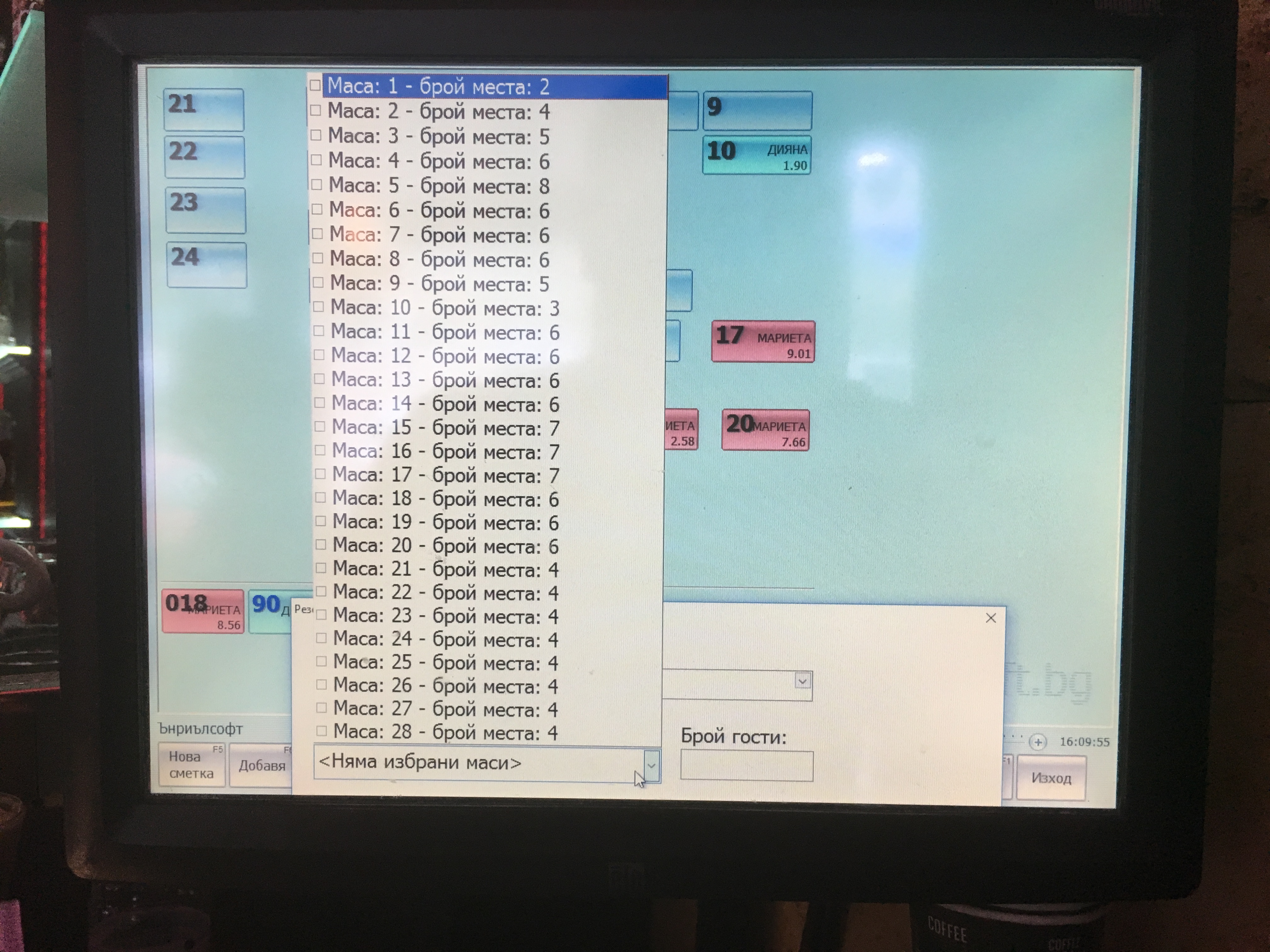 Списъкът с конфигурираните маси се центрира на екрана. Това не позволява да се направи резервация на "първите" и "последните" маси, защото те се режат от падащото меню. В същото време липсва скрол, с който списъкът да се прелисти...