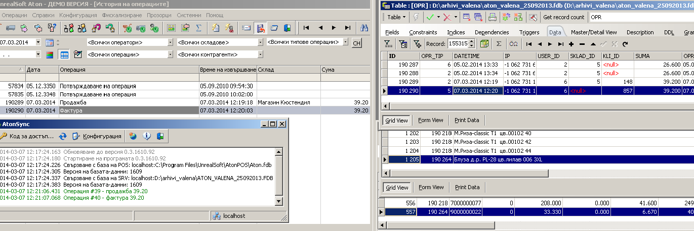 Синхронизира се само операцията в таблица opr и в справка история на операциите се вижда , но в таблиците fak, fak_el няма синхронизация съответно и в справка издадени фактури.