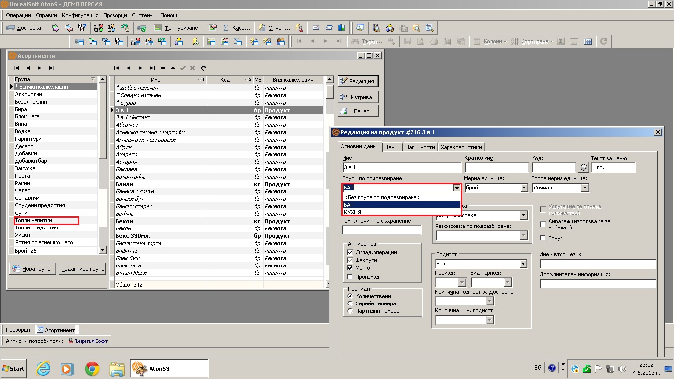 Така е по - удобно, но не можах да разбера как да прехвърля продукт активен за меню пр.(3 в 1) в група Топли напитки. От бутона редакция в групите на продукта не се виждат групите за рецепти, а само тези за продукти. Варианта беше в конфигурация ценови листи да сменя групата на артикула.